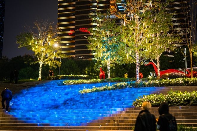 亮燈儀式在來福士戶外同步開啟,建筑四周的街道都懸掛起斑斕的流星燈飾,星光點點圍繞著整個來福士的四周,整條街的空氣就變得更為靈動,散發著濃濃的耶誕氛圍,穿行在杭州來福士摩天立體城市,即便天氣寒冷也能感覺到很溫暖。在B1下沉星階廣場設置了交互式燈光體驗,每一個動作、每一個腳步都會引起各種想象不到的光影變化,為消費者打造一個沉浸式3D互動體驗的世界。當夜幕降臨后,消費者可以邊享受購物的樂趣,邊抬眼觀望點點星塵,好似一場時空交錯的浪漫旅程。