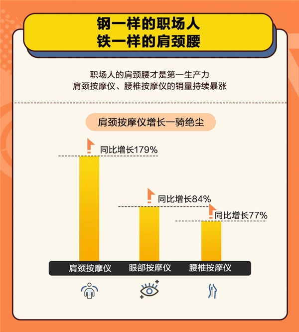 什么值得買數據顯示,2020年“雙11”期間,肩頸按摩儀銷量同比增長179%,眼部按摩儀增長84%,腰椎按摩儀增長77%。