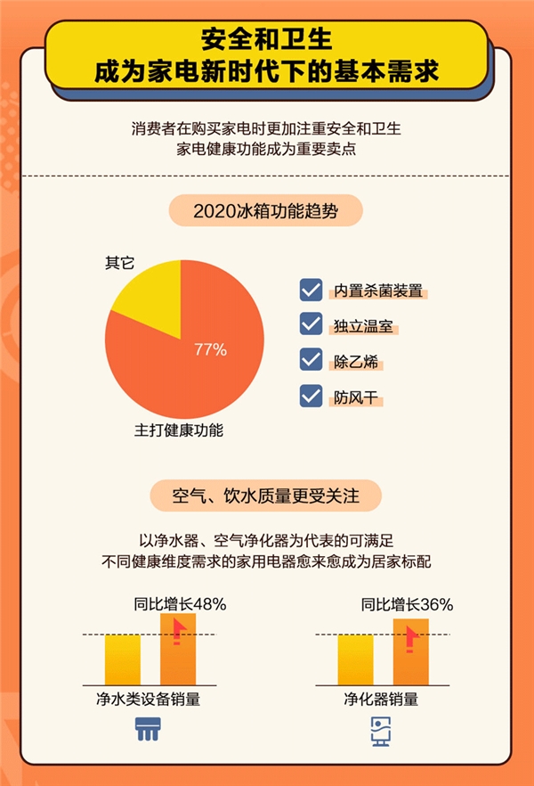 什么值得買數據顯示,消費者在購買家電時更加注重安全和衛生,健康功能已成為家電最重要賣點。以冰箱為例,“雙11”期間,主打健康安全功能的冰箱,在冰箱總銷量中占比高達77%。而以凈水器、空氣凈化器為代表的、可滿足不同健康維度需求的家用電器,愈來愈而成為居家標配,二者的銷量分別同比增長48%和36%。并且,智能家居尤其是全屋智能化家居解決方案,正在成為新趨勢。