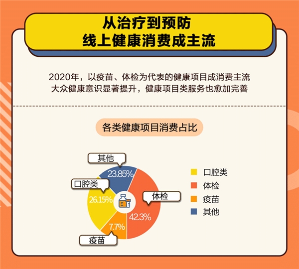 數據顯示,常規體檢、疫苗等產品熱銷,二者在健康項目總消費中的占比合計高達約50%。此外,口腔類健康項目的占比也高達26.15%,顯示口腔護理正日益受到重視。