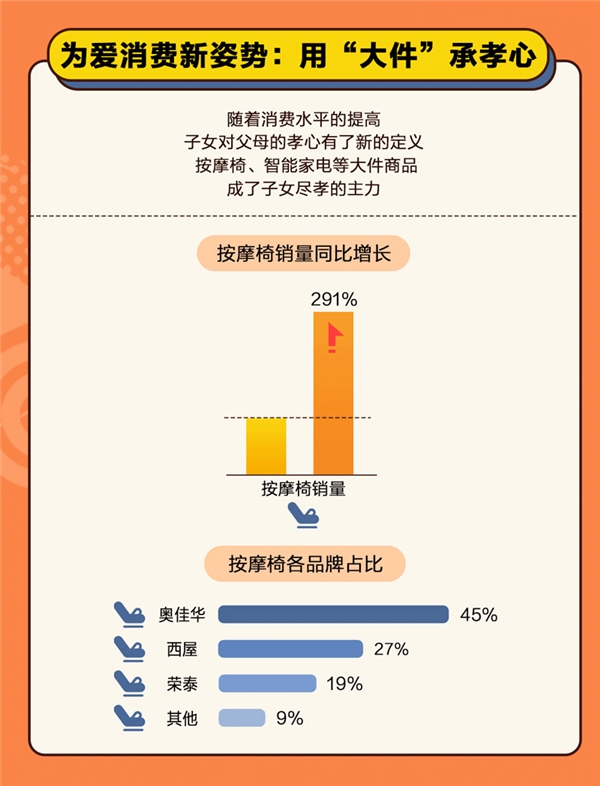 數據顯示,2020年,子女對父母的孝心有了新的定義,按摩椅、智能家電等“大件商品”,成為子女“孝心消費”的代表性產品,其中,按摩椅的銷量同比大增291%。而為每個家庭的幸福生活提供堅實保障的煙機灶具、烤箱,銷量分別同比大增175%、99%。