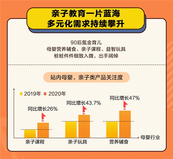 親子教育,則是家庭消費的另一種重要內容,并且,90后父母表現出明顯的“氪金育兒”傾向,母嬰營養輔食、親子課程、益智玩具等等,細致入微,消費選擇日益多元。其中,營養輔食、親子玩具、親子課程,銷量分別同比增長47%、43.7%和26%。此外,舉家出游也成為消費者熱選,親子樂園景區度假廣受歡迎。