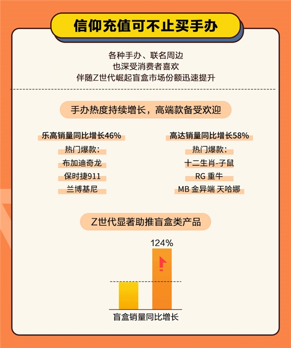 什么值得買數據顯示,2020年“雙11”期間,深受Z世代消費者喜愛的手辦、聯名周邊,正在快速崛起。其中,樂高、高達手辦銷量分別同比增長46%和58%,而盲盒類產品銷量更是同比大增124%。樂于為信仰充值的新生代消費者,讓這些昔日的邊緣市場正在逐漸成長為主流。