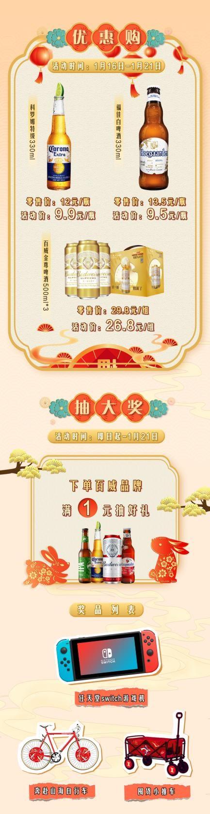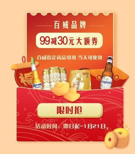 即日起到1月21日,永輝生活-詠悅匯酒庫平臺發放百威品牌5元無門檻優惠券(限時搶,當天可使用)、百威品牌99減30元大額券(當天可使用)。而且同時期,下單百威品牌滿1元抽好禮,可以抽任天堂switch游戲機、奔赴山海自行車、囤貨小推車精美獎品。