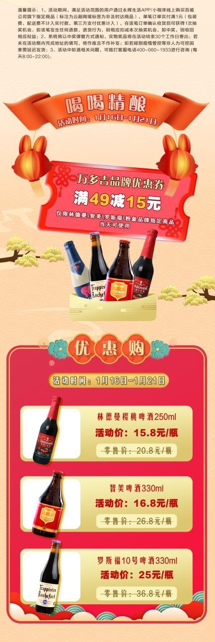 喜歡喝精釀啤酒的也不要錯過詠悅匯酒庫“好運在兔,酒在一起”活動。從1月16日到1月21日,在永輝生活-詠悅匯酒庫平臺上能領取到萬多吉品牌滿49減15元優惠券(當天可使用),可購買林德曼、智美、羅斯福、粉象品牌指定商品。