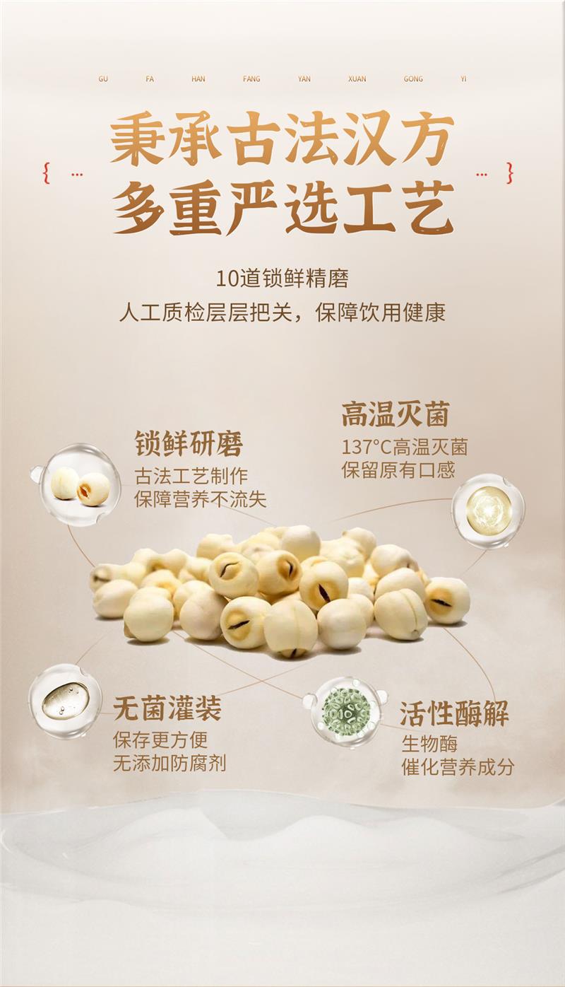 在制作工藝方面,饞大獅蓮子汁采用鎖鮮研磨工藝,用生物酶對其進(jìn)行活性酶解,既能保證蓮子營養(yǎng)不流失,又能催化其中的營養(yǎng)成分。再經(jīng)過137°高溫滅菌、無菌灌裝等處理流程,保留了蓮子原有的清甜口感。