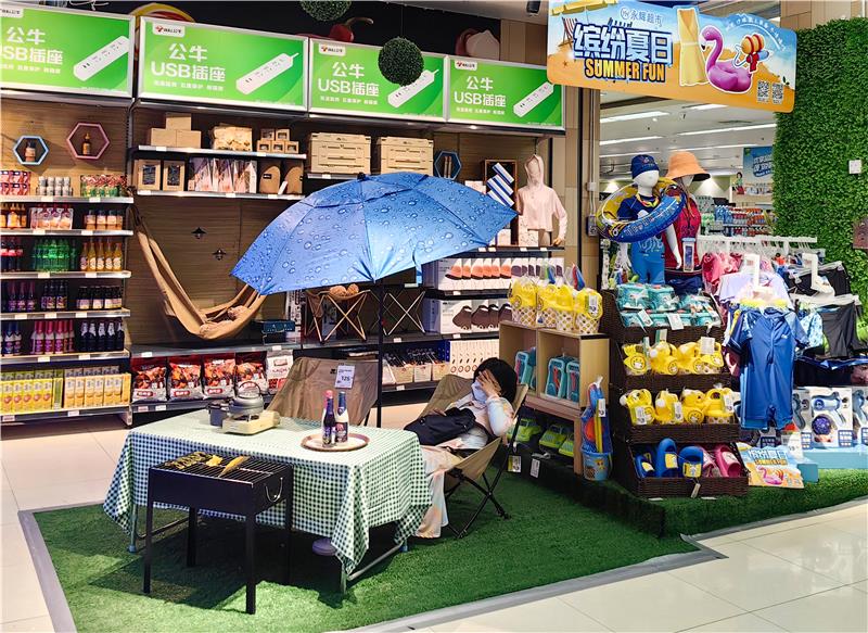 除此之外,永輝也在多家門店內(nèi)增加了場景式的主題布置,即根據(jù)季節(jié)、節(jié)慶、消費(fèi)場景的不同,在店內(nèi)公共區(qū)域設(shè)置主題并集中展示關(guān)聯(lián)產(chǎn)品。如懸掛了多個游泳圈的歡樂水上用品陳列區(qū)、布置了野餐墊和躺椅的戶外用品陳列區(qū)、集合了牙膏、牙刷、漱口水、牙線棒等關(guān)聯(lián)產(chǎn)品的口腔健康陳列區(qū)等,滿足消費(fèi)者在某一場景下的一站式購物需求。