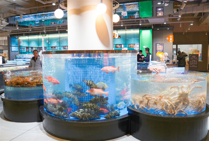 為匹配消費者的個性化需求,奧體店精心打造了整體場景,由胖東來天使城工程團隊全程參與,發揮了極大的想象力,設計以淺灰色為主色調,搭配橙色標識裝飾增添活力,動線通道自由、寬敞,點綴幽藍色的觀賞海鮮魚缸,更添氛圍感。