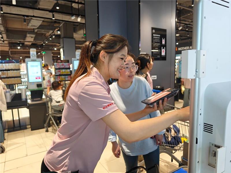 在北京鴻坤廣場(chǎng)店客流高峰時(shí)段,收銀支援員工王麗正嫻熟地疏導(dǎo)著排隊(duì)人群。“您好,這邊可以結(jié)賬,請(qǐng)跟我來(lái)!”她面帶微笑,用清晰有力的指引聲,將推著滿(mǎn)載購(gòu)物車(chē)的顧客分流至不同收銀通道。面對(duì)持續(xù)涌入的顧客,王麗始終保持著專(zhuān)業(yè)的工作節(jié)奏,一邊快速判斷各通道結(jié)賬進(jìn)度,一邊及時(shí)補(bǔ)位支援。這看似重復(fù)的引導(dǎo)工作,實(shí)則是保障顧客購(gòu)物體驗(yàn)的關(guān)鍵環(huán)節(jié)——正是這些基層員工日復(fù)一日的專(zhuān)業(yè)服務(wù),構(gòu)筑起超市高效運(yùn)轉(zhuǎn)的服務(wù)基石。